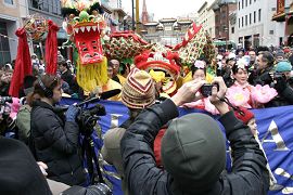 今年有大约二十个团体参加了游行,古装美女、舞龙舞狮、爆竹贺喜、腰鼓乐队,还有挥舞彩旗的儿童骑单人滑轮车表演。游行队伍中阵容最庞大的当属法轮功队伍,除了舞龙、舞狮、唐装仙女外,几十名身着金黄色服装的法轮功学员组成的腰鼓方阵,伴随着“法轮大法好”的歌声,个个精神抖擞、意气风发,博得沿途观众的喝彩和掌声,让街道沿途的观众目不暇接。