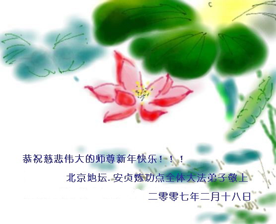【明慧网二零零七年二月二十日】北京公安系统内的大法弟子、大陆公安系统大法弟子、大陆警察大法弟子、大陆公安系统大法弟子、黑龙江警察系统的大法弟子、闽北公安系统内大法弟子、武警部队全体大法弟子、中国武装警察部队边防部队大法弟子及家属大法弟子、大陆一退伍军人和全体家人、第二炮兵全体大法弟子、大陆全体退役军人大法弟子、大陆军中大法弟子、西宁、青藏兵站部的大法弟子、广州军区大法弟子,给师尊李洪志先生拜年、祝师尊新年快乐!