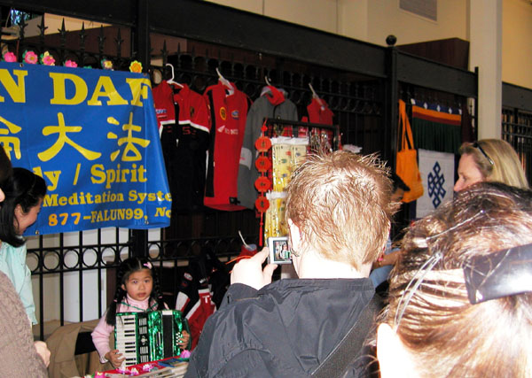 六岁小弟子在摊位演奏手风琴“法轮大法好”。乐声悠扬,音符准确,引来许多游客的赞赏、询问。不少人为小弟子拍照。