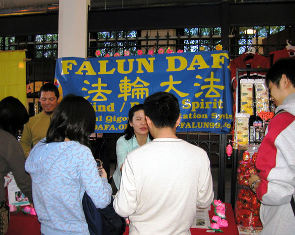 只见介绍法轮功的摊位前,学员们给络绎不绝的游客分送手工制作的莲花,讲解法轮功真相,派发材料。
