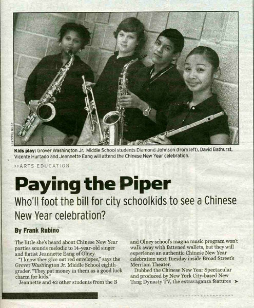 费城周报(Philadelphia Weekly)记者福兰克.鲁宾诺(Frank Rubino)一月十七日报导说,费城格罗瓦.华盛顿初中十四岁的简奈特.依杨(Jeannette Eang)会唱歌、吹长笛,当她和她的同学们知道要去看新唐人的全球华人新年晚会的时候,高兴极了。