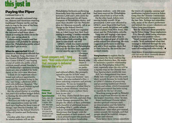 KYW电台记者另一记者凯伦.菲利普斯(Karin Phillips)一月十二日报导,希望帮助孩子们得到赞助,去观看新年晚会。报导说,二零零七年中国新年始于二月十八日,大费城亚洲文化中心将在美丽安剧院举办新唐人全球华人新年晚会,组织者希望得到帮助以满足给孩子们提供体验的机会。