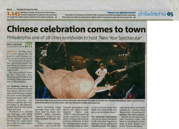 费城简讯报(The Bulletin)记者克里斯田.波里达若(Christian Polidoro)一月二十三日报导说,二零零四年新唐人电视(NTDTV)的全球华人新年晚会刚开始时,只在全球的七个城市演出。随着这两年名气越来越大,她扩大到十七个城市的二十五场表演,但费城没有被列入日程。
