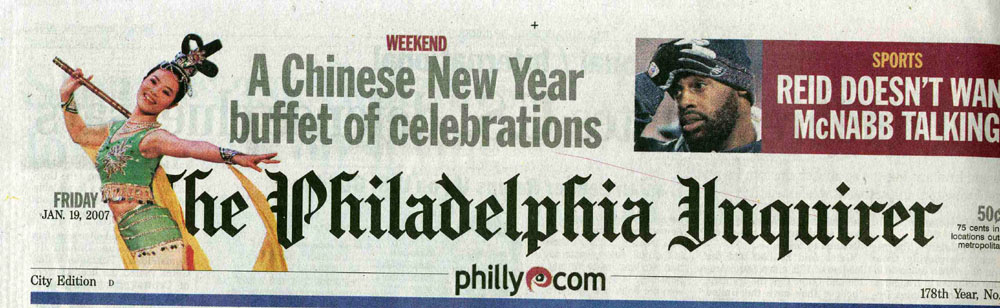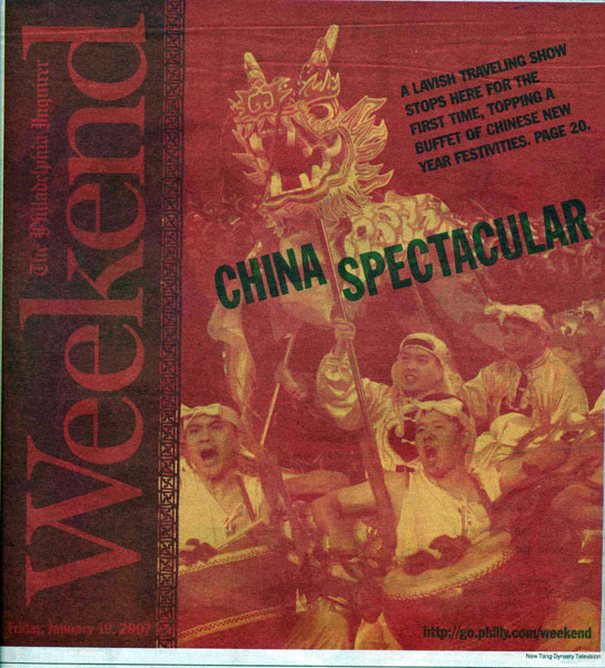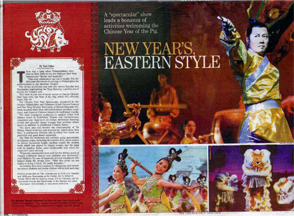 费城最大的报纸费城问询报( The Inquirer)不但赞助了晚会,并且在演出前的周末大篇幅的以三版报导了晚会。记者托尼·卡拉斯 (Toni Callas)一月十九日在文章写道,“以前费城居民需要到纽约去看中国新年晚会‘神话与传说’,今年在当地就可看到了,新唐人晚会首次来到费城在美丽安剧院上演。演出突出中国的黄金年代--唐朝的艺术。猪年,始于二月十八日。”
