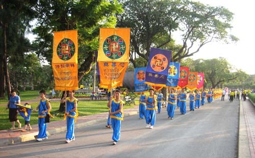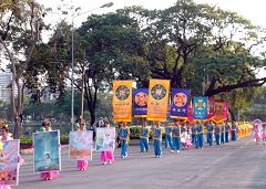 ![]() 法轮功学员的游行队伍色彩亮丽,美好祥和 |