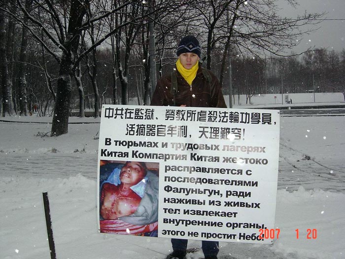 不仅是这一天,莫斯科的法轮功学员近一个月来,为了让世人认清中共的邪恶本质,唤醒人们的良知,每周六利用法律规定可以不用准证的个人抗议,把中共活摘法轮功学员器官牟利的罪恶展示在中使馆前。不管刮风下雪,寒风刺骨,学员们轮换着从上午十点一直到下午六点,从不耽误。学员们的坚定正念和不畏艰苦的精神,使很多中国人和俄罗斯人为之动容。一位附近的莫斯科居民跟学员卓娅说:“我常来这里散步,看到你们利用自己的休息时间为别人去呼吁,真让我感动,我能为你们做点什么?”学员说:“你可以签名表达你的正义支持。”也有不少中国人不但接受真相资料,还站在学员旁边照相留念。甚至中使馆的人也接了真相资料。