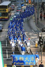 ![]() 台湾天国乐团走过港岛区的繁华闹市。 | ![]() 法轮功学员手持横幅,呼吁世人快快找真相。 |