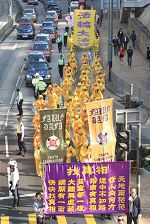 ![]() 参与游行人士要求释放被非法关押的法轮功学员及法办中共恶首。 | ![]() 游行队伍走过铜锣湾的繁忙街道。 |