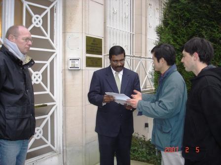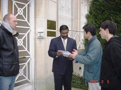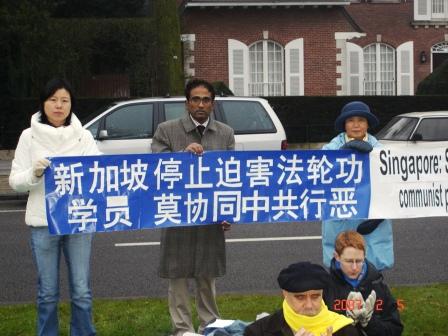 在当地警察的协助下,比利时法轮功学员代表与拉维先生一同约见了新加坡使馆一等秘书及领事阮麻先生(Rama)。法轮功学员向他讲明了法轮功学员在新加坡受到的不公正对待及为什么来新加坡使馆抗议,并希望新加坡政府不要追随中共政权,参与迫害法轮功。这位新加坡官员表示,法轮功在新加坡是合法组织,新加坡是允许人们修炼法轮功的。当他提到所有的组织都应该遵守法律时,特意赶来的拉维先生以自己为法轮功学员辩护的亲身经历告诉他,针对法轮功学员的起诉是不公正的,而且人们在新加坡没有请愿的权利,这就是为什么今天他来这抗议的原因。他尤其谈到在他为法轮功学员辩护时,竟然发生了新加坡警察命令他交出辩护用的物证这样的事情。他呼吁全球的新加坡公民都去新加坡使馆来表达关注。