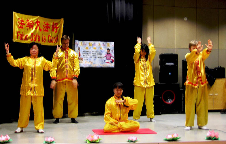 很多光临健康展示会的人们对于礼堂入口处的法轮功展位都留下了深刻的印象。金光闪闪的“法轮大法”横幅以及庄严、慈悲的音乐伴随着人们步入展厅。