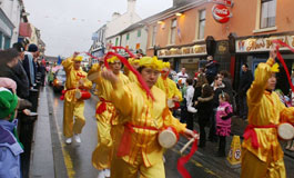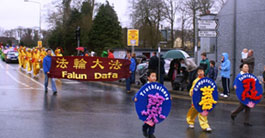 下午三点三十分,游行从普特立思(Portlaoise)的中心广场出发,来自五十四个团体近千人参加了这次游行,有爱尔兰传统音乐乐队、匈牙利舞蹈队、巨型花车、氢气球花车、老爷车队、少年摩托车队,等等。法轮功学员的队伍是唯一的一个主要由华人组成的团体。