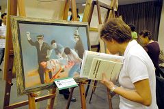 一对中年夫妇经过法轮功展位时,一面折服于法轮功功法的祥和,一面准备购买一本关于中共活摘器官的调查报告。当她接过学员免费赠送的报告后,捧在胸前,面色凝重的承诺一定会让亲友、同事知道中共残害法轮功学员的兽行。