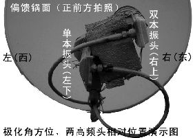 另外一个细节:明慧网有同修说Ku高频头对极化角要求不严格,我认为这种说法不完全正确。对于接收W5新唐人这样的强信号节目,极化角差一些是没有关系,但是要调试接收亚太2R卫星上的节目,极化角差一点都不行。差一点就会少收很多台,并且其他台的信号质量也非常弱。具体调星的方法明慧网已有很多报导,这里不再详述。我最终固定的方位角为:接收W5新唐人节目的Ku高频头信号线接口水平向西稍偏下(面对天线基本水平向左、稍偏下方,见下图);接收亚太2R卫星节目的单本振Ku高频头信号线接口水平向东,稍微向下(基本与地面平行,见下图)。