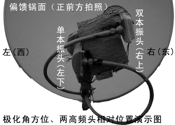 在调整好主收亚太2R卫星节目的基础上,手持双本振Ku高频头在单本振Ku高频头右上方5厘米左右距离晃动,要同时接好电视看信号质量,找到最佳接收位置。新唐人对亚洲信号已经加强,调试时高频头左右晃动5公分都有信号,只是信号强弱不同。经调试得知,最佳的一锅双星偏收W5新唐人的双本振Ku高频头的接收位置为:在主收亚太2R卫星单本振Ku高频头的右上方较靠上的方位,不向以前有同修所说的紧挨着,要相距5公分左右,两高频头平行,但接收新唐人的高频头距离要较主收亚太2R卫星的高频头靠近锅面1—2厘米(见下图)。由于两高频头之间有约5厘米的距离,我是在中间垫了一块软泡沫塑料,用细铁丝绑住固定的。