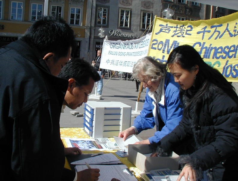 慕尼黑大学学法律的学生德律力斯(Dryllis)来自希腊,他告诉记者,他和同伴,捷克来的马嚓尼克(Mazanik)正在做有关器官移植法律方面的论文,他们签名制止中共残暴行径,希望能找出一条正当途径,既能挽救更多人,又不伤害任何生命。