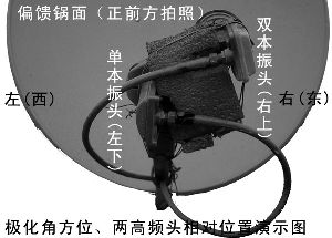 另外一个细节:明慧网有同修说Ku高频头对极化角要求不严格,我认为这种说法不完全正确,对于接收W5新唐人这样的强信号节目,极化角差一些是没有关系,但是要调试接受亚太2R卫星上的节目,极化角差一点都不行。差一点就会少接收很多台,并且其他台的信号质量也非常弱。具体调星的方法明慧网已有很多报导,这里不再详述。我最终固定的方位角为:接收W5新唐人节目的Ku高频头信号线接水平向西稍偏下(面对天线基本水平向左、稍偏下方);接收亚太2R卫星节目的 单本振Ku高频头信号线接口水平向东,稍微向下(基本与地面平行)。见下图: