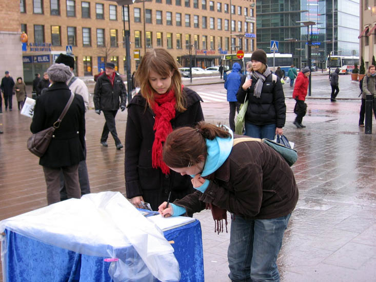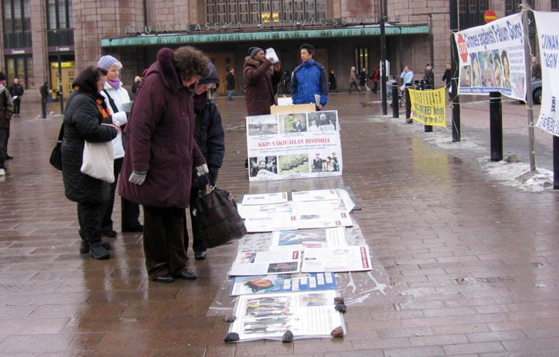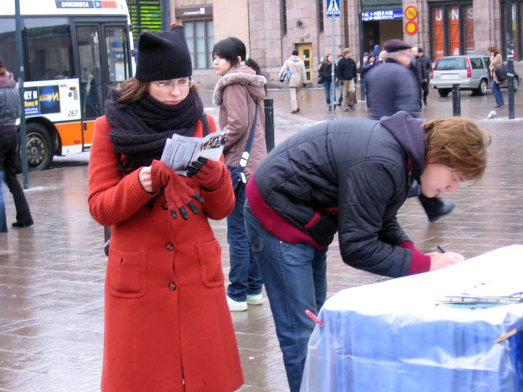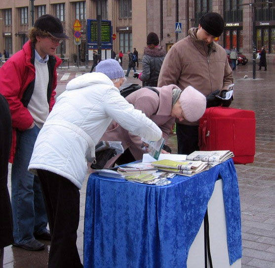 【明慧网二零零七年三月五日】二零零七年三月三日,晚冬的赫尔辛基(Helsinki)下着蒙蒙细雨,芬兰退党服务中心、大纪元义工和一些法轮功学员像往常一样,每当退党人数跨过一百万时,他们都会利用周末公休日,到人流量最大的市中心火车站旁,向人们传递这个喜讯,同时告诉人们,中共恶党对法轮功和中国民众的迫害还在继续,为了你、为了他、为了我、为了我们的子孙后代,世人不应沉默。