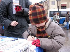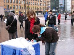一位芬兰男士问法轮功学员小王,中共为什么迫害法轮功?天安门自焚案是怎么回事?当小王告诉他,天安门自焚案完全是中共编导出的一场特大假案时,他说:太残忍了,你们做的对。然后他仔细地看了展板,接着前去签名声援退出中共邪恶组织。