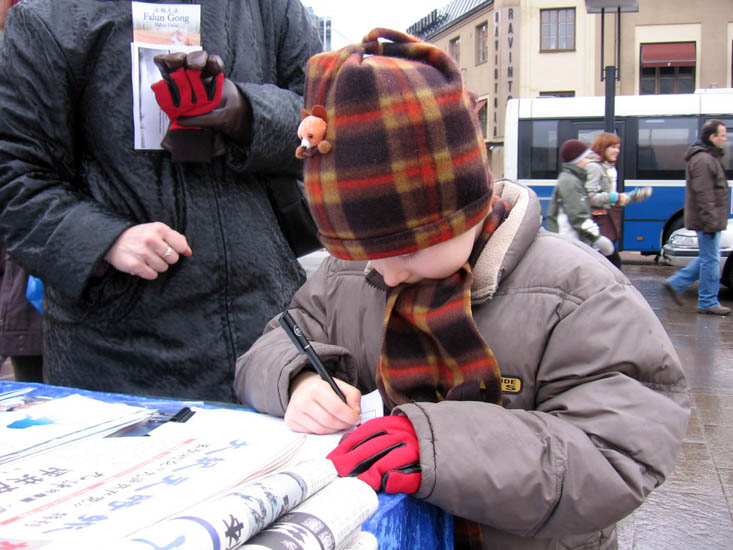 没等“《九评共产党》引爆退党大潮,一千九百万中国人退出中共”的中、英文横幅挂好,已经有人前来签名声援了。一个十七岁的小伙子找到法轮功学员Sinikka建议说:你们应该向芬兰总统和外交部长讲真相,芬兰政府不应在中共对法轮功的迫害一事保持沉默。