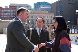 ![]() 在三月三十日“声援退党两千万”集会上,张继延公开宣布脱离中共使馆。 加拿大国会议员罗伯-安德斯(左)同张继延(右)握手表示支持。 |