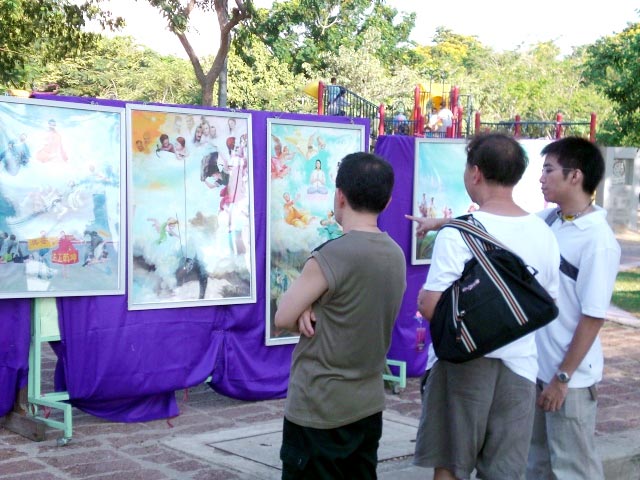 美展从每天下午四点开始,展出的几十幅画由修炼法轮功的艺术家创作,不少是刻画法轮功学员无辜遭受中共残酷迫害,但仍然对信仰坚贞不移的作品,表现的内涵令人震撼,感人泪下。法轮功学员向前来观赏的游人解说每一幅作品,通过画展帮助人们进一步了解法轮功,让更多的泰国人知道为什么如此祥和的法轮功会遭受中共无理的打压,知道了在中国正发生着一场迫害。