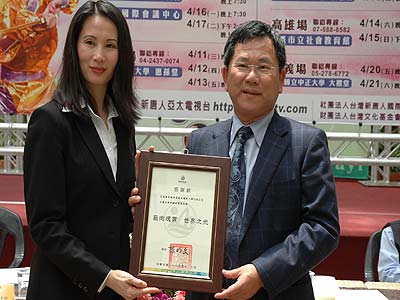 ![]() 嘉义县长陈明文(右)颁赠感谢状:艺术瑰宝 世界之光 |