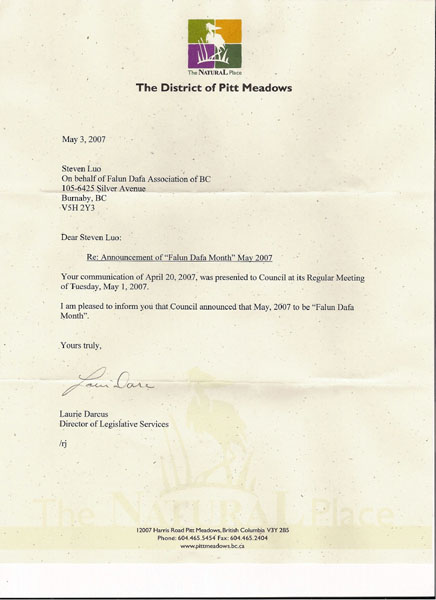 【明慧网二零零七年五月十二日】二零零七年五月三日,加拿大不列颠哥伦比亚省皮特麦德区(District of Pitt Meadows)议会致信加拿大法轮大法协会,褒奖二零零七年五月为“法轮大法月”。