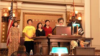 ![]() 议长路易斯•瑞德(Lewis Reed)(右一)请法轮功学员向与会者进一步介绍法轮功及发生在中国的迫害 |