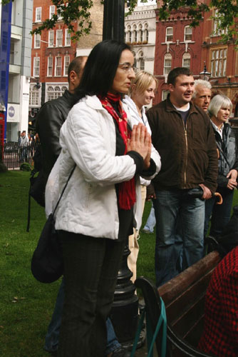 ![]() 虽然下雨,但人们仍被法轮功学员的表演所吸引 |