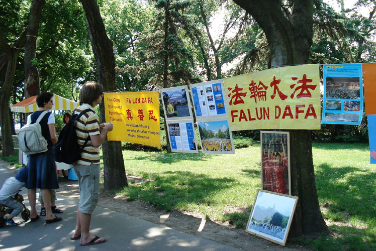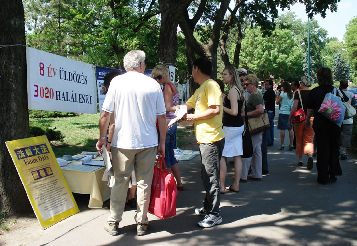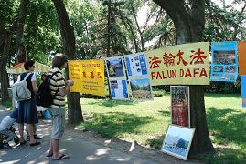 这天天气特别好,阳光灿烂,游人如织。“普度”、“济世”音乐震撼着每一个过路人的心。“什么是法轮大法?”“为什么会受到迫害?”“是谁这么残暴的对待这些看上去都很善良的人?”人们迫切的了解着真相,同时也很疑惑,在这现代化的文明时代,这种灭绝人性的事情到底是怎么发生的。当人们了解到法轮大法已洪传八十多个国家和地区,法轮功学员只有在中国大陆遭受迫害时,许多当地人讲,类似这样的事情他们并不陌生,那是在受共产党统治的时候。有的人看过真相展板后问道:“中国还是共产党执政吗?”在他们心中,共产党就是暴政的代名词。