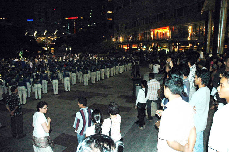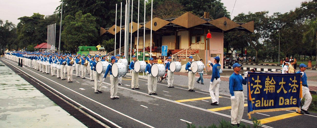【明慧网二零零七年五月二十日】二零零七年五月十九日,来自台湾的天国乐团首次庄严亮相于马来西亚吉隆坡的多个旅游景点,包括黑风洞、马国旅游年新兴著名景点“大马之眼”摩天轮、及闻名世界的双峰塔,给这里的民众带来无限的惊喜与震撼。由男女老少法轮功学员组成的乐团团员,身着蓝衣白裤,踩着整齐的步伐,充满自信的昂首向前迈进,给大家吹奏了“法轮大法好”、“法正乾坤”、“法鼓法号震十方”等乐曲,使许多民众闻之垂泪。在被感动的同时,大家亦竞相以手中的相机或手机拍下这珍贵的一幕。
