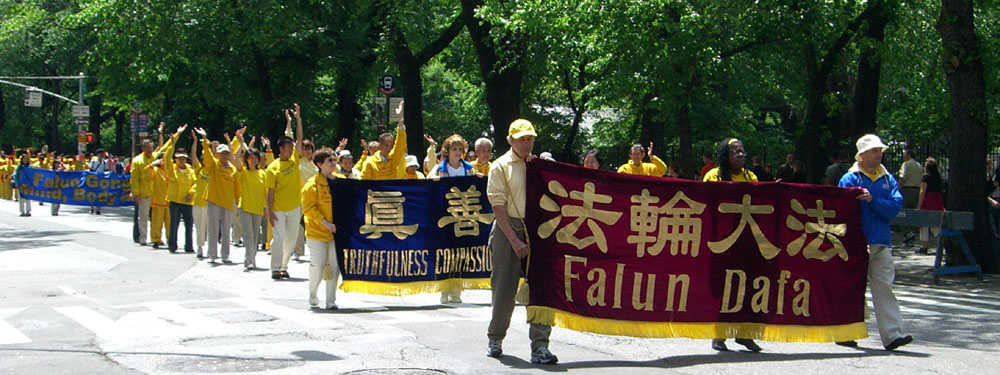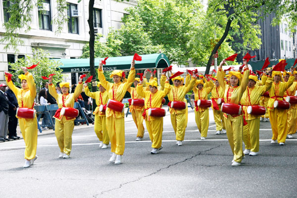法轮功队伍以天国乐团开路,雄壮的乐曲震撼着人们的心灵;仙女队轻歌曼舞,展示着中国舞的韵味;炼功队伍演示着法轮功功法,舒展祥和;腰鼓队精神昂扬,令人振奋。两个小时的游行中,“法轮大法好”的歌声乐曲一直响彻五大道。人们微笑、鼓掌、挥手、竖大拇指、拍照、摄影,为法轮功喝彩、欢呼。