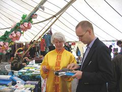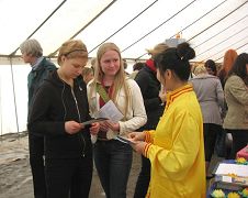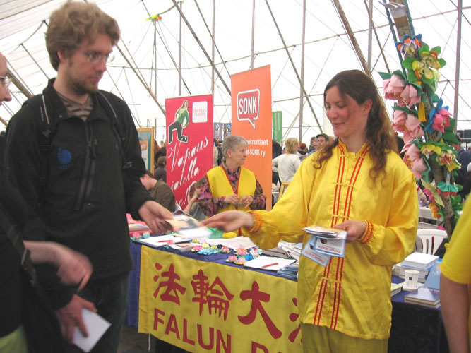 一位来自土尔库市(Turku)的大学教师告诉学员,他的很多学生知道中共迫害法轮功,但却不了解法轮功,经常会向他提相关问题,他本人也很有兴趣了解,因此和学员谈了很久,并立即购买了《转法轮》、《法轮功》和教功录像带。