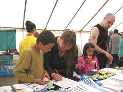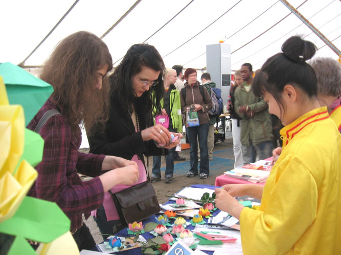 二十六日上午大雨倾盆,场地泥泞,但这丝毫没阻挡住兴致勃勃来参与活动的人们。场地内不同国家、不同民族的鼓乐声此起彼伏、文化艺术品林林总总、各色小吃诱人品尝,好不热闹。只见法轮功学员身着亮丽的金黄色炼功服,站在摆满不同语种洪法和真相资料、征签簿和纸莲花的桌子前,面带微笑,迎接着络绎不绝的民众。