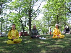 ![]() 学员在人们休息场地演示法轮功第五套静功 |