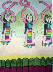 国二扯铃班何宜频:《雪山白莲》中各个姑娘手中套着两串白色的水袖闻乐起舞。话说回来,她们以白色的水袖代表西藏传统的物品「哈达」。而「哈达」所代表的意义正是尊敬客人的意思,这使所有的观众都很感动也很欣慰。