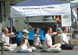 悬挂的横幅上用图片展现了法轮功学员被活摘器官的惨烈场面,展台上摆放着各种语言的法轮功真相资料。各展板上展示了法轮功学员无辜遭受中共迫害的照片和说明。对熙熙攘攘的路人而言,如此惨烈的照片和旁边祥和、宁静的炼功人形成了一个鲜明的对比。很多人纷纷驻足观看,和法轮功学员交谈。