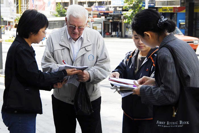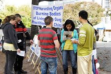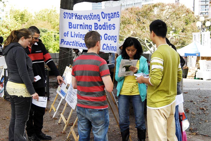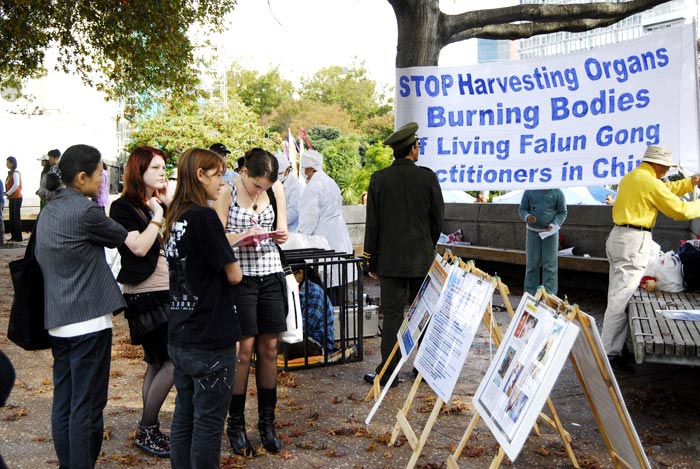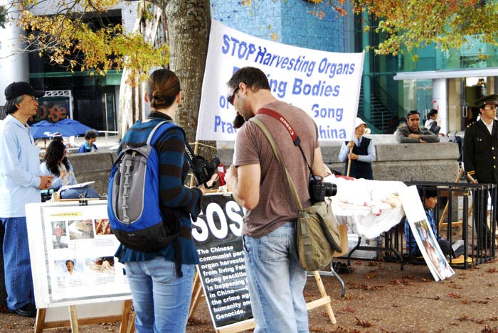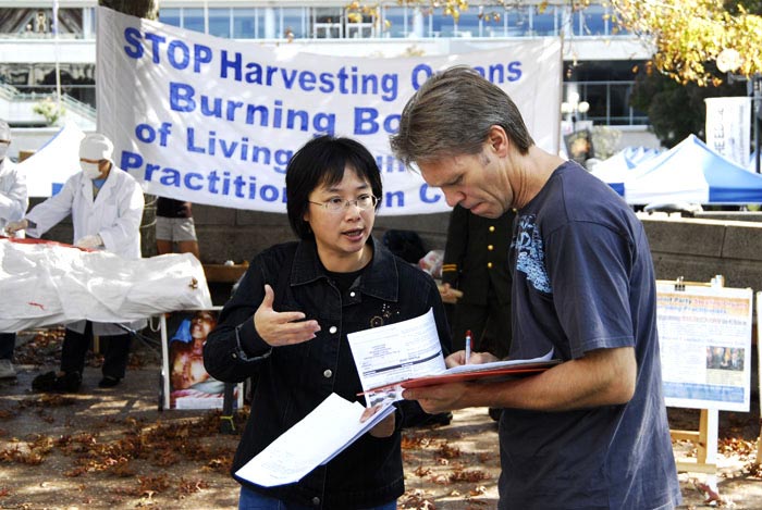 也有中国人路过看到了真相。有人对迫害事实还存有疑虑,法轮功学员真诚的送给他一本加拿大独立调查团所发布的《血淋淋的器官摘取----关于指控中共摘取法轮功学员器官的调查报告修订版》,希望他能多了解一些真相。