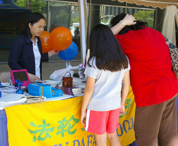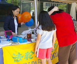 法轮功学员在现场设立了洪法展位及义务教功点。有一对菲律宾裔母子来到展位想学功。学员珍妮教他们炼了法轮功的五套功法。刚学完第一套功法,这位女士就说:“我感觉非常的舒服。”学完五套功法后,她连说了好几次“真的很舒服!”