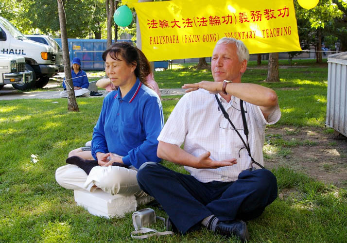 一群来自法国的游客,来到炼功点拍下了炼功的场面。一位讲法语的法轮功学员给他们介绍了法轮功洪传世界各地的情况,他们非常感兴趣。一位男士马上就坐在地上学第五套功法。