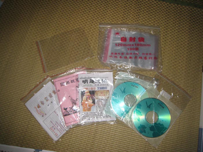 市场上有一种塑料自封袋,封口处有一胶条,非常适合发放真相资料,尤其是真相光盘,各种大小的都有,可根据需要选购。我们一般常用的有光盘和 32 开书本大小。光盘大小的可装入光盘、小册子或折叠好的真相传单(横竖各折一次即可,不会挡住胶条),32 开书本大小的可装入正常书本大小的《九评》。