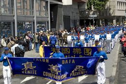 游行持续了三个半小时。法轮功学员们的队伍所到之处,无不赢得热烈的掌声和竖起大拇指的叫好声。随着游行的队伍,学员把揭露中共迫害法轮功的真相资料递送给了两旁的观众,其中包括很多中国人。当一个中国人接过法轮功学员给他的资料时,他含着泪水,抱住学员轻轻的说:“我是大陆的学员,谢谢你们,谢谢你们!你们对大陆弟子的帮助太大了,你们减轻了大陆弟子很大的压力。”