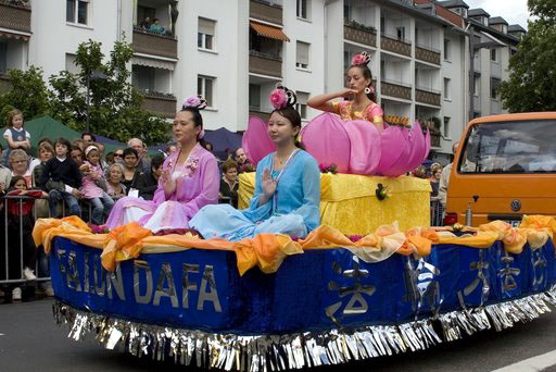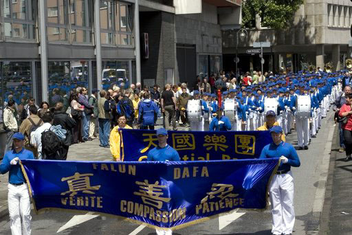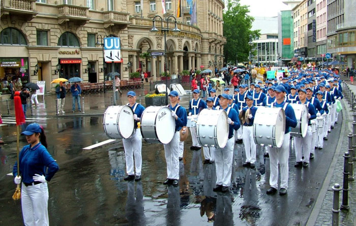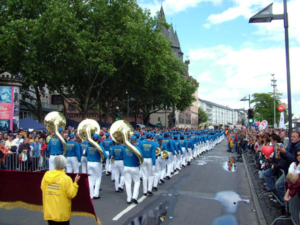 【明慧网二零零七年六月二十七日】二零零七年六月二十三日,德国第五届法兰克福文化节大游行(Great Kultur-Parade)在法兰克福湖畔的大街上举行。该音乐节每年大约有十二万人的观众,是欧洲最大的音乐节之一。由一百六十名法轮大法弟子组成的“天国乐团”首次参加了本次游行。法轮功学员身着蓝衣蓝帽白裤,手持各种金光闪闪的铜管乐器,肩挂白色军鼓,排着整齐的队伍,后边排着身着彩衣翩翩起舞的仙女和黄衣黄裤雄姿勃发的腰鼓队。