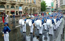 下雨了,大街上不参加游行的人群开始显的焦躁不安,不知所措。瞬间,雨倾盆而下,而且越来越大。顿时马路上除了游行的彩车空无一人,观看的人们纷纷躲在大街两边的屋檐下。天国乐团的乐手们静静的站在雨中没动。时间一到,“法轮大法好”的乐声响起,整齐的队伍迈着坚定的步伐向前行进。路边的人们都为天国乐团所震撼,有两个行人还跑过来给吹长笛的学员打伞。天国乐团成员的衣裤鞋帽都湿透了,大雨没有减弱,乐声也没有减弱,鼓声号声盖过了雨声,这支独特的队伍在大雨中更显的雄壮。顿时掌声雷动,被震撼的人们仿佛除了鼓掌已不知用什么言语才能表达自己的感受。