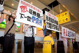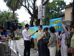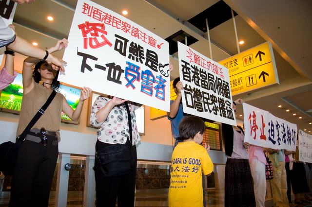 ![]() 部份法轮功学员在高雄小港机场举起看板, 让民众知道香港政府无正当理由遣返台湾民众 |