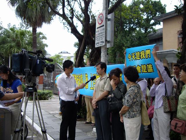 部分遭受遣返的法轮功学员,二十八日下午前往立法院递送陈情书给立法院长王金平,由立法院秘书处副处长郑健中代为收下。陈情书的诉求中提到,“请陈水扁总统出面,要求香港政府即刻释放被扣留的台湾人民,并允许他们依其合法权利入境香港;向被无理对待的台湾人民道歉;要求香港政府遵守基本法,拒绝中共迫害法轮功政策!”