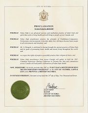 鉴此,我,维多利亚市市长阿兰•罗维(Alan Lowe),特此褒奖二零零七年五月份为BC省首府维多利亚市“颂扬真、善、忍的法轮大法月”。