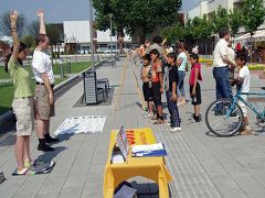 【明慧网二零零七年六月三日】二零零七年五月二十六日星期六,法轮功学员来到斯洛伐克西部的巴诺凡斯奈德贝布拉伐市(Banovce nad Bebravou),让更多的市民了解发生在中国的中共对法轮功学员的残酷迫害。他们设置请愿桌,并且在桌上摆放信息材料后,开始展示法轮功五套功法。