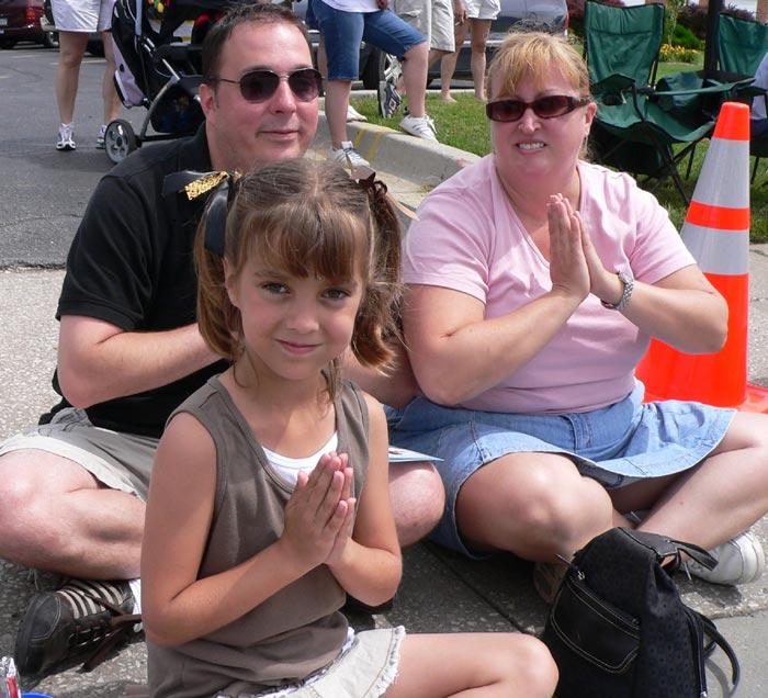 ![]() 瞧!十岁的麦奇和父母正对着法轮功学员的花车合十呢! |