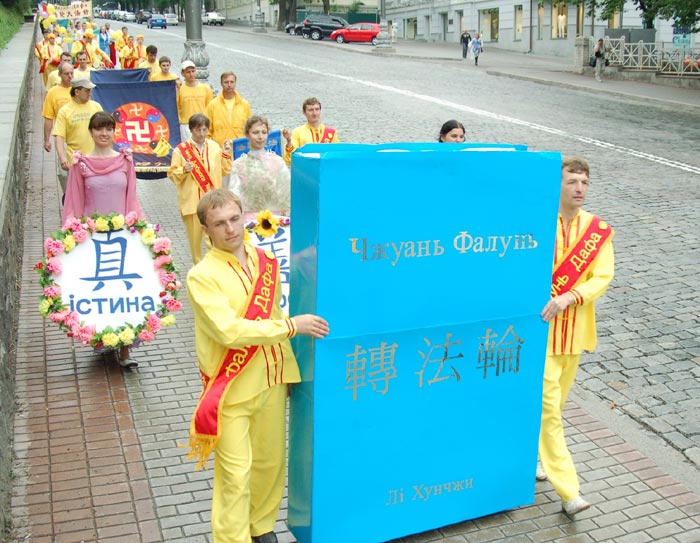 ![]() 法轮功学员们冒雨游行,传递大法的美好 |